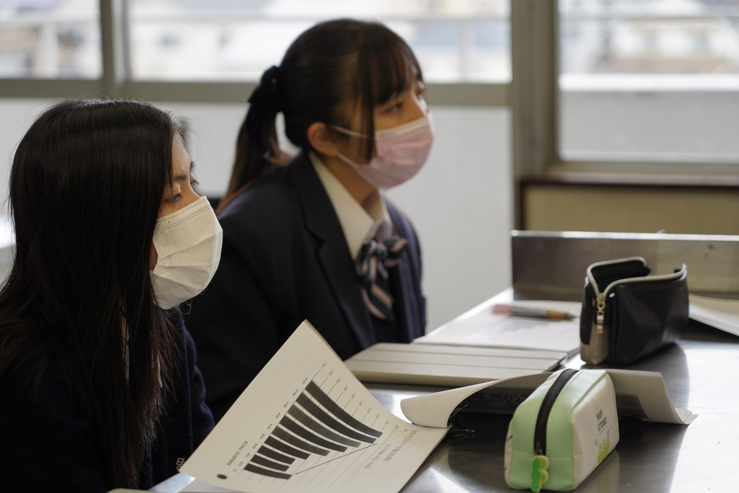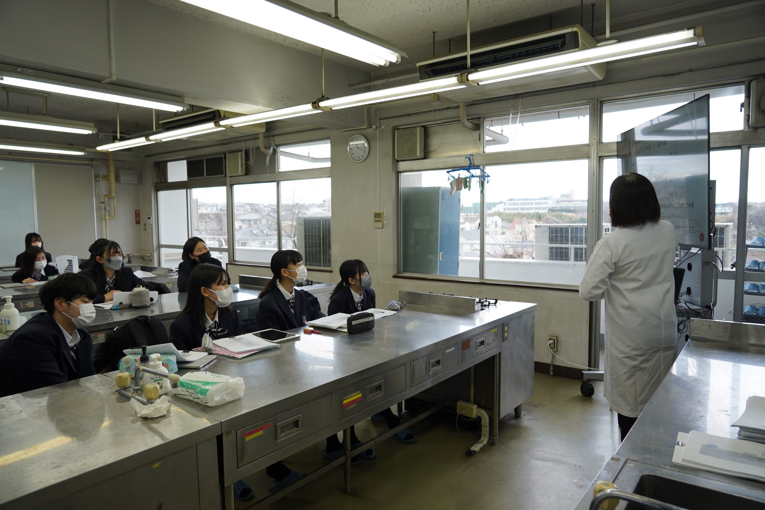 セレクト授業1年料理入門で、2月14日と2月16日に横浜栄養専門学校から先生をお招きして『栄養障害の二重負荷やせすぎも太りすぎも大問題』というタイトルで授業していただきました。やせに対する願望が高い女子高生ですが、逆にやせていることで様々な病気のリスクがあるというお話から始まりました。特に女性は、女性ホルモンの関係で骨粗鬆症になりやすいこと、やせている妊婦はあかちゃんにも影響を与えてしまうことなどを学びました。最後に自分のBMIと適正体重を算出したのですが、思っている以上に適正体重が重いことに生徒たち驚いているようでした。食べることと健康は大きく繋がっていて、そこに加えて運動習慣を持つことが重要だと先生はおっしゃいました。日ごろ、きびきび動くだけでも効果があるとのことです。生徒たちは大変興味深く先生のお話を聞いていました。