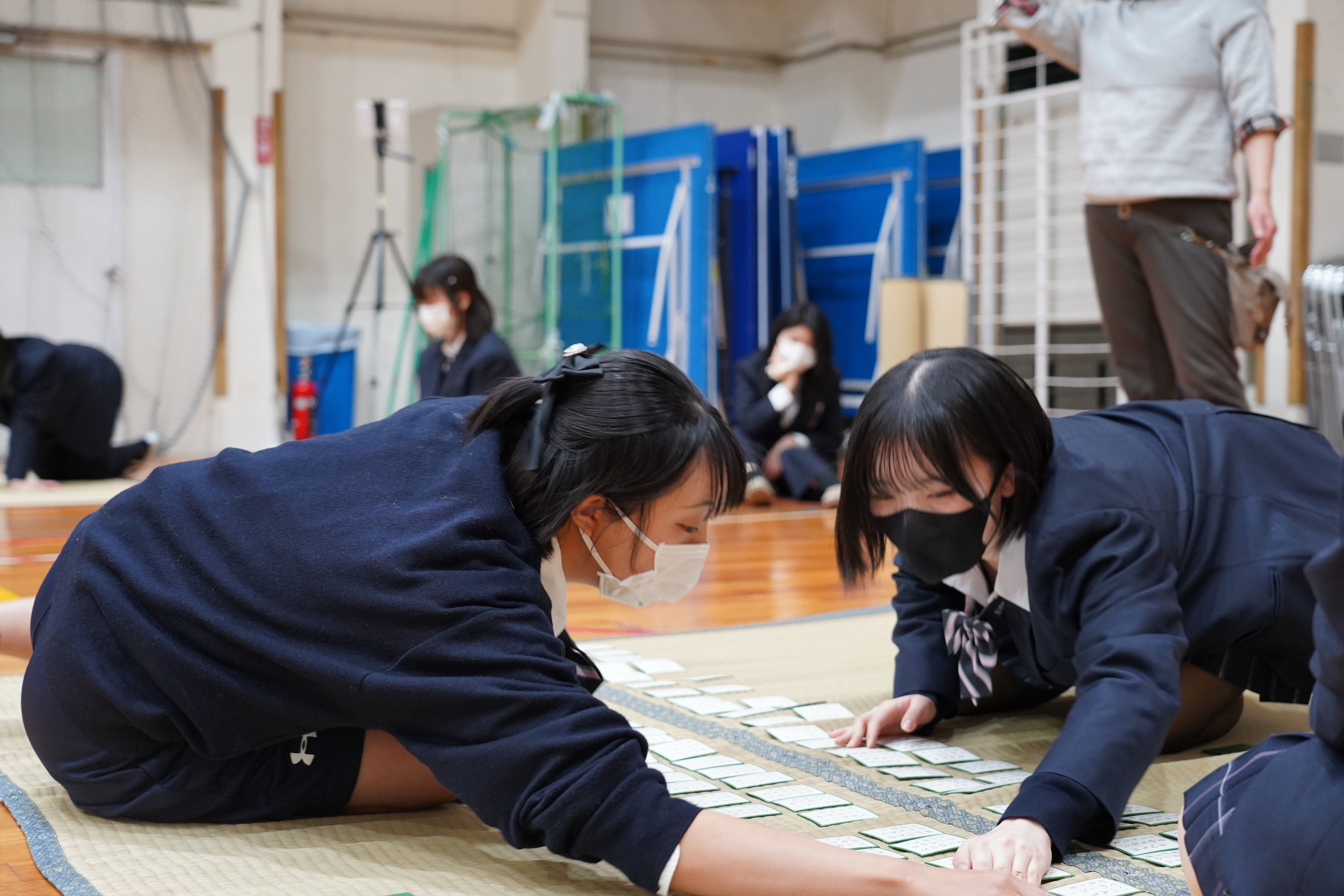 1月15日(水)、全学年全員参加の個人戦のかたちで、百人一首大会が行われました。当日は、百人一首係が進行のお手伝いをしました。また、今年度は読み手に生徒も参加しました。一人ひとり耳をすまし札に見入る真剣な姿が印象的でした。